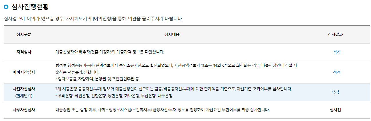 이곳에선 대출신청자의 대출자격정보를 확인하는 기본적인 내용이 들어갑니다. 신청 후 적격판정을 받으면 서류를 챙겨서 은행방문을 하시면 됩니다.