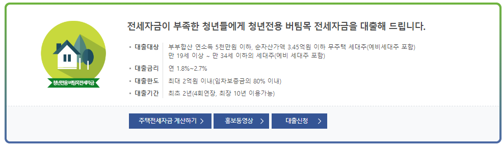 우선 청년전용버팀목전세자금 대출은, 만 19세 이상 ~ 만 34세 이하의 세대주(예비 세대주)를 대상으로 시행하고 있는 대출입니다.